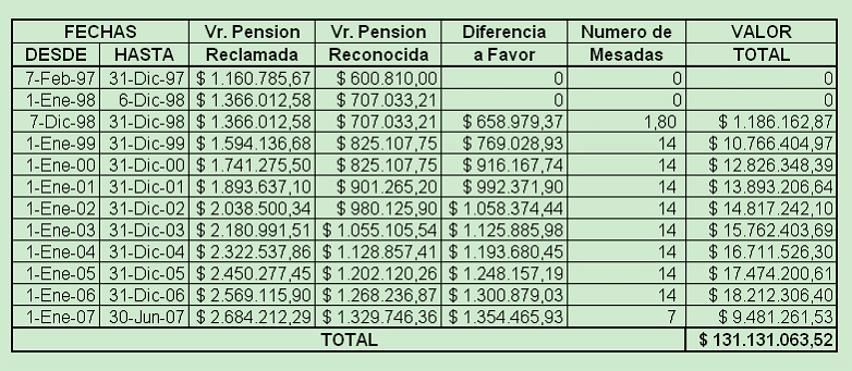 Como lo decidido por el juez colegiado sobre prescripción de las mesadas, no fue objeto del recurso, el valor de la diferencia causada entre el 7 de diciembre de 1998 y el treinta (30) de junio de dos mil siete (2007), es de $131'131.063,52; y a partir de esta última fecha el valor de la pensión, teniendo en cuenta los aumentos legales, será de $2'684.212,29, todo de conformidad con el siguiente cuadro: