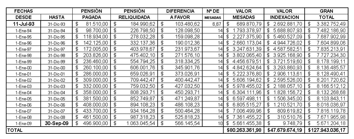 Como la demandada no alegó prescripción corresponde al actor por diferencias pensionales causadas de la fecha de reconocimiento de la pensión el 11 de julio de 1993, hasta el mes de septiembre de 2009, la suma total de $127.943.036.17, debidamente indexadas, conforme al siguiente cuadro: