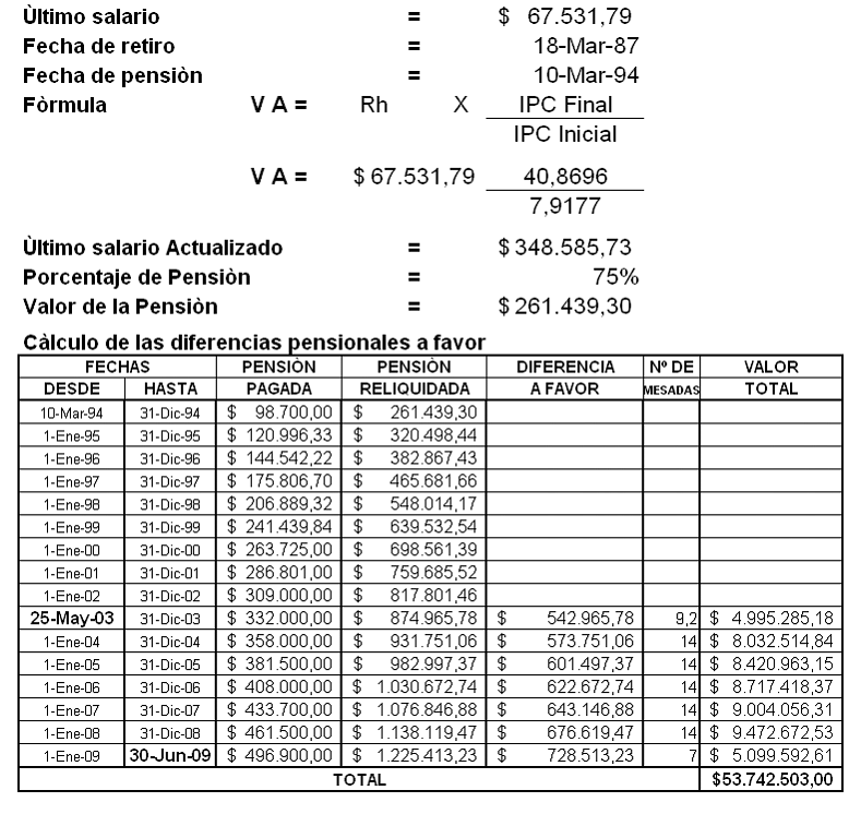 Para la liquidación de la indexación reclamada se tomarán en cuenta los siguientes datos, sobre los cuales no existe discusión: que la desvinculación de la actora de la demandada ocurrió el 18 de marzo de 1987; que último salario mensual devengado por la demandante fue de $67.531.79; que ésta cumplió con los requisitos para acceder a la pensión el 10 de marzo de 1994; que el saldo de las mesadas generado como consecuencia de la reliquidación, causado con anterioridad al 25 de mayo de 2003, se encuentra prescrito.