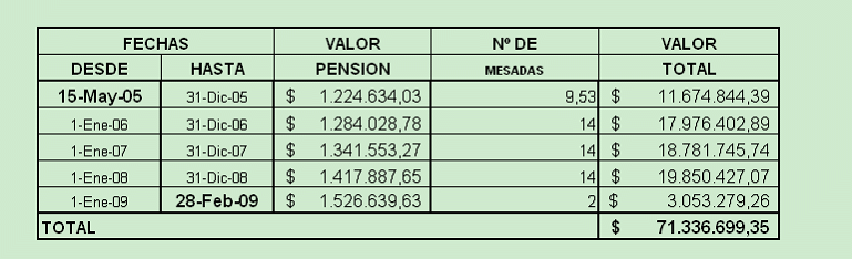 Establecido el correcto monto de la mesada pensional que debió reconocérsele al actor, es decir de $1'224.634.03, las diferencias insolutas a cargo de la demandada entre el 15 de mayo de 2005 y el 28 de febrero de 2009, arrojan un total de $71'336.699,35, lo cual está reflejado en el siguiente cuadro: