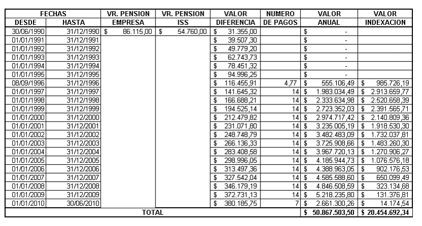 Hechas las operaciones del caso, para el período comprendido entre el 8 de septiembre de 1996 y el 30 de junio de 2010, las diferencias pensionales suman $50.867.503,50, más la respectiva indexación de $20.454.692,34, sin perjuicio de la que se cause hasta la fecha en que se produzca el pago, lo cual es posible detallar en el siguiente cuadro: