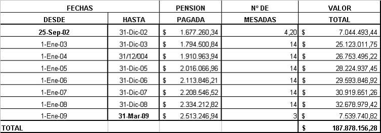 Las mesadas adeudadas hasta noviembre de 2008 ascienden a la suma de $187'878.156, 28.