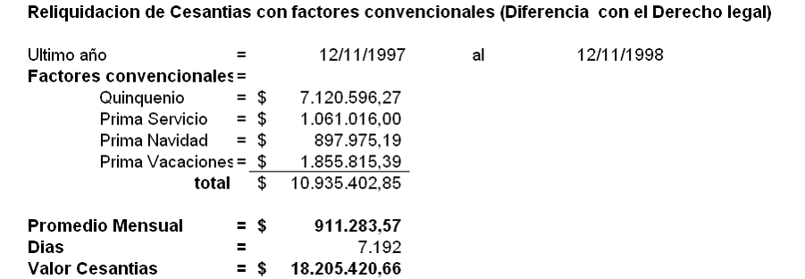 Tomando el promedio mensual de los factores por derechos convencionales, en aquella proporción que se dejó de incluir en el salario base de liquidación de la cesantía, y efectuando la liquidación en la forma que lo hizo la entidad accionada en la documental visible a folios 165 a 167 ídem, resulta una diferencia a pagar por esta prestación social que asciende a la cantidad de $18.205.420,66, tal como se explica en la siguiente tabla: