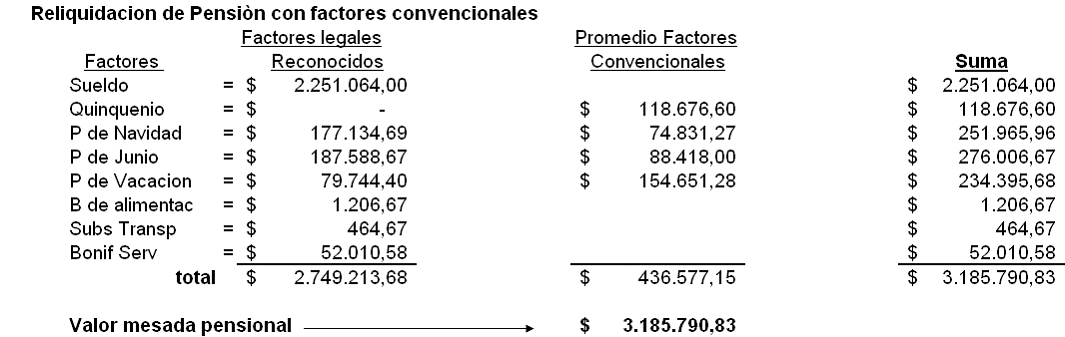 (III) Por pensión de jubilación convencional condenada en proceso anterior adelantado ante la justicia ordinaria, la accionada otorgó dicha prestación a partir del 13 de noviembre de 1998, con una mesada inicial de $2.749.214,oo mensuales, cuyos factores salariales fueron: Sueldo $2.251.064,oo, prima de navidad $177.134,69, prima de junio $187.588,67, prima de vacaciones $79.744,40, bono de alimento $1.206,67, subsidio de transporte $464,67 y bonificación por servicios $52.010,58,oo (folio 717 ídem).