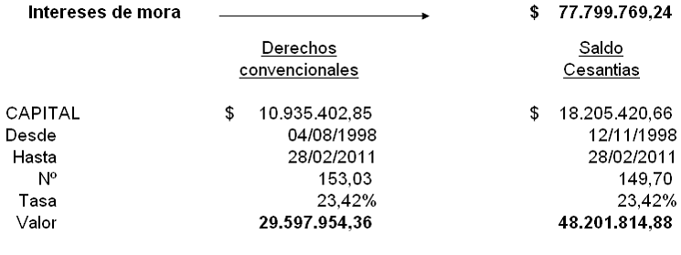 Frente a los intereses de mora que el demandante en su apelación solicita igualmente se concedan respecto del saldo de cesantía, hechos los cálculos correspondientes, por éste concepto y por el saldo de prestaciones o beneficios convencionales, el quantum a pagar liquidado hasta el 28 de febrero de 2011 asciende a las sumas de $48.201.814,88 y 29.597.954,36, respectivamente, tal como a continuación se detalla: