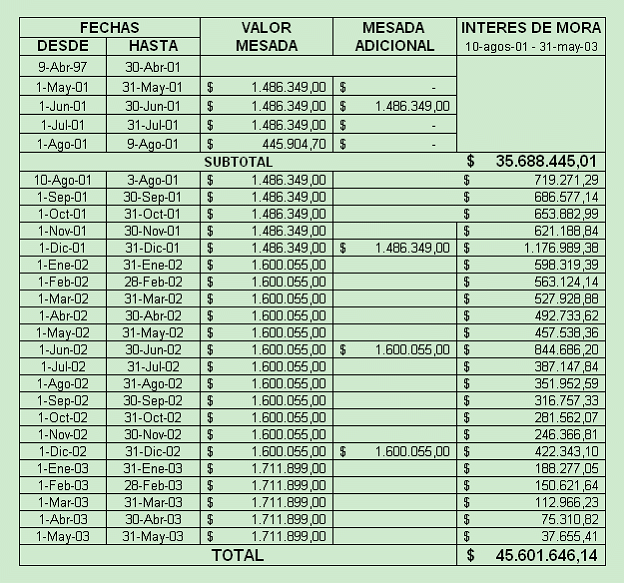 Así las cosas, se modificará la sentencia de primer grado y en su lugar se condenará la demandada a pagar al demandante la suma de $45'601.646,14, por concepto de intereses moratorios, entre el 10 de agosto de 2001 y el 31 de mayo de 2003.