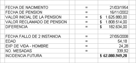 Previamente a resolver el recurso de casación, esta Corporación aclara que no le asiste razón a la réplica respecto de la falta de interés para recurrir de la demandada, pues atendiendo el valor de la diferencia pensional ordenada por el Tribunal y la vida probable del pensionado, se encuentra que existe interés económico para recurrir, ya que con la sola incidencia futura del reajuste pensional que corresponde a la suma de $62.080.949,28 se superan los 120 salarios mínimos legales vigentes, como se puede observar en el siguiente cuadro: