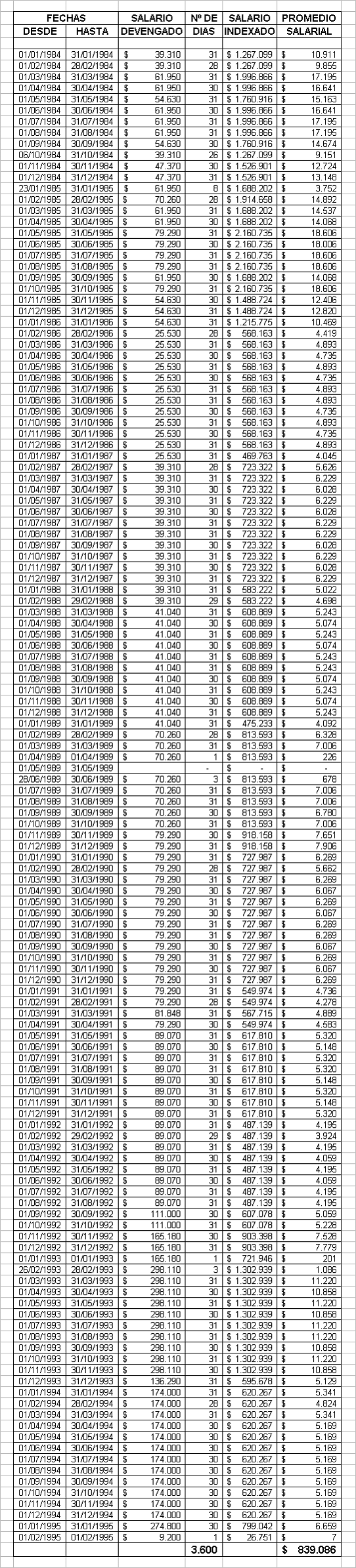 Así las cosas, descendiendo a la situación pensional del demandante, para cuantificar el ingreso base de liquidación de conformidad con el artículo 21 de la Ley 100 de 1993, se tomará el promedio de lo devengado y sobre lo cual hubiera cotizado el afiliado, durante los 10 años que anteceden al reconocimiento de la pensión, que equivale a 3.600 días; se identifica la última cotización del accionante, que en este caso corresponde al 1° de febrero de 1995, y a partir de ella, se efectúa un conteo – retrocediendo en la historia laboral o salarial- que obra en el expediente a folios 9 -10, 16 – 21, 24, 26 – 31, 55 – 59, 65 – 68, 72 – 73, 79 – 84 y 87, hasta completar un lapso igual a 10 años de tiempo cotizado, que se remonta en esta ocasión al 1° de enero de 1984. Dichos salarios base se actualizan a la fecha de la pensión, que lo es el 25 de mayo de 2004, y se promedian. Su sumatoria constituye el IBL. Es de aclarar, que la fórmula empleada para calcular el IBL en los términos anteriores, es la referida en el antecedente jurisprudencial que rememora la censura, sentencia del 20 de abril de 2007 radicado 29470, y que se traduce en la siguiente: