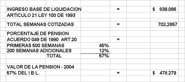 Al anterior IBL ($839.086,oo), se le calcula el 57% que es el monto porcentual de la pensión, según el artículo 20 del Acuerdo 049 de 1990, por haberse mantenido aplicable para las personas en régimen de transición (artículo 36 de la Ley 100 de 1993), y conforme al número de semanas cotizadas durante toda la vida laboral del afiliado, que corresponde a 702,2857 (folios 28 y 66 vto del cuaderno del Juzgado). Así, se obtiene el valor de la prestación pensional para el 25 de mayo de 2004, es decir, hechas las operaciones del caso, una mesada inicial de $478.279,oo, como se explica en la tabla que a continuación se inserta: