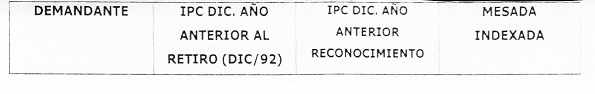 La inconformidad de la parte que represento estriba en que el Tribunal de manera equivocada tuvo en cuenta como “IPC diciembre año anterior retiro (Dic. / 92)”, la cantidad de 31.51 para todos los demandantes, cuando de conformidad con el reporte del DANE, para esa data corresponde el 33.487745, razón por la que todas las primeras mesadas de los 18 demandantes quedaron mal liquidadas (fls. 1567 y 1568 0.1), en detrimento de los intereses de mi procurada, resultando unas condenas más onerosas, a su cargo, las que deben reducirse en la forma como se demuestra en el presente cargo.