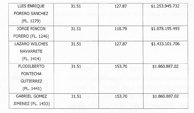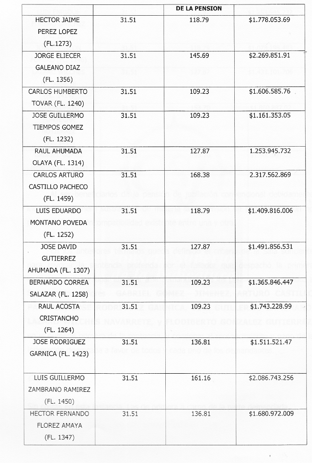 HÉCTOR JAIME PÉREZ LÓPEZ en la suma de $1.680.782.04 a partir del 22 de diciembre de 2001; JORGE ELIECER GALEANO DÍAZ la suma de $2.145.673.86 a partir del 8 de febrero de 2004; CARLOS HUMBERTO TOVAR en la suma de $1.518.693.37 a partir del 20 de diciembre de 2000; GABRIEL GÓMEZ JIMÉNEZ en la suma de $1.311.357.91 a partir del 2 de noviembre de 2005; JOSÉ GUILLERMO TIEMPOS GÓMEZ en la suma de $1.097.817.44 a partir de 5 de enero de 2000; RAÚL AHUMADA OLAYA en la suma de $1.156.140.46 a partir del 17 de noviembre de 2002; CARLOS ARTURO CASTILLO PACHECO en la suma de $2.154.428.86 a partir del 2 de febrero de 2007; LUÍS EDUARDO MONTAÑO POVEDA en la suma de $1.332.688.01 a partir del 20 de abril de 2001; JOSÉ DAVID GUTIÉRREZ AHUMADA en la suma de $1.410.240.72 a partir del 31 de enero de 2002; BERNANDO CORREA SALAZAR en la suma de $1.404.124.43 a partir del 20 de agosto de 2001; RAUL ACOSTA CRISTANCHO en la suma de $1.647.861.30 a partir del 29 de octubre de 2000; JOSÉ RODRÍGUEZ GARNICA en la suma de $1.428.829.82 a partir del 11 de diciembre de 2003; LUIS GUILLERMO ZAMBRANO RAMÍEZ en la suma de $1.355.443.47 a partir del 31 de enero de 2006, HECTOR FERNANDO FLOREZ AMAYA en la suma de $1.589.010.13 a partir del 24 de septiembre de 2003; LUIS ENRIQUE FORERO SÁNCHEZ en la suma de $1.092.031.11 a partir del 16 de abril de 2002; JORGE RINCON FORERO en la suma de $913.974.00 a partir del 24 de marzo de 2001; LÁZARO WILCHES NAVARRETE en la suma de $1.354.700.21 a partir del 22 de mayo de 2002 y FLODILBERTO FONTECHA GUTIÉRREZ en la suma de $1.624.496.48 a partir del 15 de julio de 2002.