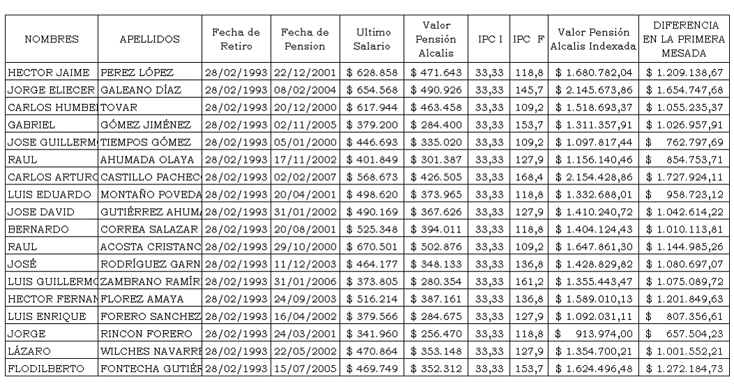 Respaldan sus súplicas en haber trabajado al servicio de la demandada así: HECTOR JAIME PÉREZ LÓPEZ el 3 de junio de 1970, JORGE ELIECER GALEANO DÍAZ, 22 de febrero de 1971, CARLOS HUMBERTO TOVAR el 1 de febrero de 1969, GABRIEL GÓMEZ JIMÉNEZ el 20 de septiembre de 1972, JOSÉ GUILLERMO TIEMPOS GÓMEZ el 1 de febrero de 1973, RAUL AHUMADA OLAYA el 9 de diciembre de 1970, CARLOS ARTURO CASTILLO PACHECO el 24 de enero de 1975 pero antes había ingresado el 17 de enero de 1972 al 31 de diciembre de 1974, LUIS EDUARDO MONTAÑO POVEDA el 28 de julio de 1968, JOSÉ DAVID GUTIÉRREZ AHUMADA el 24 de marzo de 1971, BERNARDO CORREA SALAZAR el 12 de marzo de 1971, RAUL ACOSTA CRISTANCHO el 8 de julio de 1968, JOSÉ RODRÍGUEZ GARNICA el 3 de enero de 1973, LUIS GUILLERMO ZAMBRANO RAMÍREZ el 19 de julio de 1972, HECTOR FERNANDO FLOREZ AMAYA el 23 de febrero de 1972, LUIS ENRIQUE FORERO SÁNCHEZ el 17 de febrero de 1971, JORGE RINCON FORERO el 7 de julio de 1969, LAZARO WILCHES NAVARRETE el 15 de septiembre de 1972, y FLODILBERTO FONTECHA GUTIÉRREZ el 17 de enero de 1972; la última convención colectiva suscrita por la entidad demandada y el Sindicato Nacional de Trabajadores de la Empresa Alcalis de Colombia Ltda –ALCO LTDA- tuvo vigencia de dos años contados a partir del 1° de julio de 1992 hasta el 30 de junio de 1994; en dicho acuerdo convencional se estipuló en el artículo 178 que la suscripción de la misma se realizó para revocar el proceso de disolución y liquidación de ALCALIS, aprobado por la Junta Directiva de Socios y así asegurar la continuidad y desarrollo de la empresa; el representante legal de la demandada le comunicó a los trabajadores no aforados, la decisión de darles por terminado el contrato de trabajo de forma unilateral y sin justa causa, pagándoles los salarios a los demandantes hasta el 28 de febrero de 1993; al momento del despido los actores devengaban como salarios las siguientes sumas: HECTOR JAIME PÉREZ LÓPEZ, $611.089.oo, JORGE ELIECER GALEANO DÍAZ, $629.966.00, CARLOS HUMBERTO TOVAR $ 603.842.oo, GABRIEL GÓMEZ JIMÉNEZ $379.200.oo, JOSÉ GUILLERMO TIEMPOS GÓMEZ $446.693.oo, RAUL AHUMADA OLAYA $385.840.oo, CARLOS ARTURO CASTILLO PACHECO $568.673.00, LUIS EDUARDO MONTAÑO POVEDA $ 485.120.00, JOSÉ DAVID GUTIÉRREZ AHUMADA $446752.oo, BERNARDO CORREA SALAZAR $ 506.400.oo, RAUL ACOSTA CRISTANCHO $655.657.00, JOSÉ RODRÍGUEZ GARNICA $ 464.177.oo, LUIS GUILLERMO ZAMBRANO RAMÍREZ $ 373.805.oo, HECTOR FERNANDO FLORES AMAYA $516.214.oo, LUIS ENRIQUE FORERO SÁNCHEZ $363.622.00, JORGE RINCON FORERO $329.570oo, LAZARO WILCHES NAVARRETE $470.864.oo, y FLODILBERTO FONTECHA GUTIÉRREZ $ 469.749.oo; el artículo 130 del acuerdo convencional de 1992-1994 estipuló el siguiente régimen pensional “Los trabajadores que a diciembre treinta y uno (31) de 1992 tengan los siguientes rangos de antigüedad se pensionaran así: