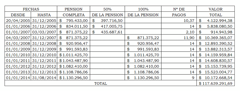 Por concepto de retroactivo pensional de la señora María Ofir Ruíz López se adeuda la suma de $117.639.291.69, hasta el mes de agosto de 2014, sin perjuicio de las mesadas que se causen en adelante, conforme con el siguiente cuadro: