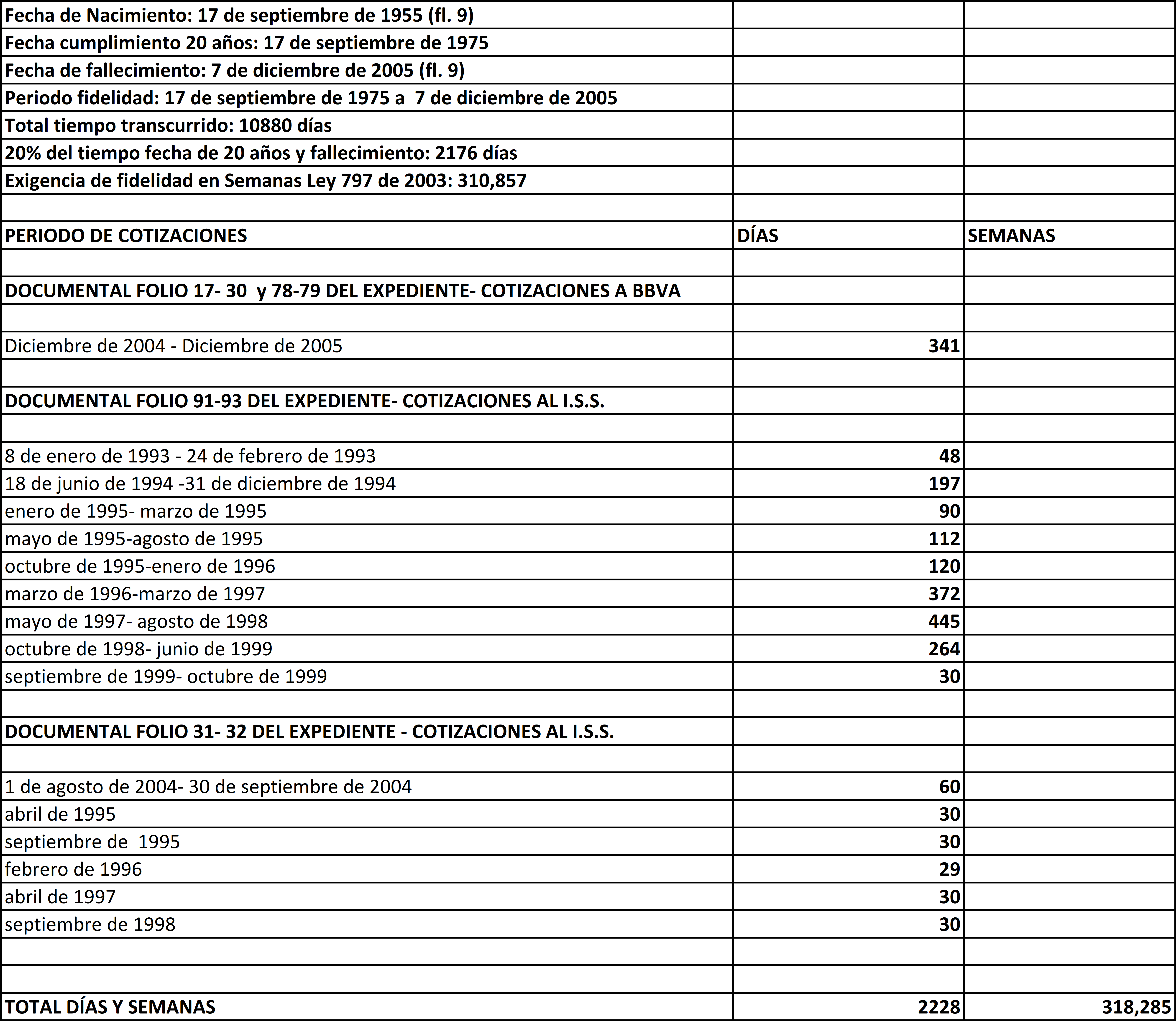 Aunque el Tribunal no discriminó las motivaciones de su apreciación mediante la cual encontró acreditadas 259.28 semanas entre el 17 de septiembre de 1975 y el 7 de diciembre de 2005, lo cierto es que el afiliado cotizó al Fondo demandado, de conformidad con las documentales de folios 17 a 30 y 78 y 79 del cuaderno principal, un total de 341 días, entre el mes de diciembre de 2004 y diciembre de 2005, así como al Instituto de Seguros Sociales, a la luz de la historia laboral de folios 91-93 del expediente, entre las siguientes fechas así: el 8 de enero de 1993 y el 24 de febrero de 1993, 48 días, el 18 de junio de 1994 y el 31 de diciembre de 1994, 197 días, de enero a marzo de 1995, 90 días, de mayo a agosto de 1995, 112 días, de octubre de 1995 a enero de 1996, 120 días, de marzo de 1996 a marzo de 1997, 372 días, de mayo de 1997 a agosto de 1998, 445 días, de octubre de 1998 a junio de 1999, 264 días y de septiembre a octubre de 1999, 30 días y, según las documentales de folio 31 y 32 y 60 y 61, relativa a la liquidación provisional del bono pensional, aportada por ambas partes al juicio, para el Instituto de Seguros Sociales, entre el 1 de agosto de 2004 y el 30 de septiembre de 2004, 60 días, los cuales, subraya la Sala, de conformidad con el análisis que se hizo para el primer cargo, deben contabilizarse para efectos de la prestación, a pesar de que el causante venía afiliado al Fondo demandado desde el 1 de enero de 2001, pues no se tratan de días aportados de manera simultánea en la administradora privada y, además, por los meses de abril de 1995, septiembre de 1995, febrero de 1996, abril de 1997 y septiembre de 1998, 149 días, de modo tal que, sumadas todas estas cotizaciones, ascienden a un total de 2228 días, equivalentes a 318.285 semanas aportadas entre el momento del cumplimiento de los 20 años de edad del afiliado, esto es, el 17 de septiembre de 1975 y el de fallecimiento, es decir, el 7 de diciembre de 2005, tal como se observa de manera discriminada, en el siguiente cuadro: