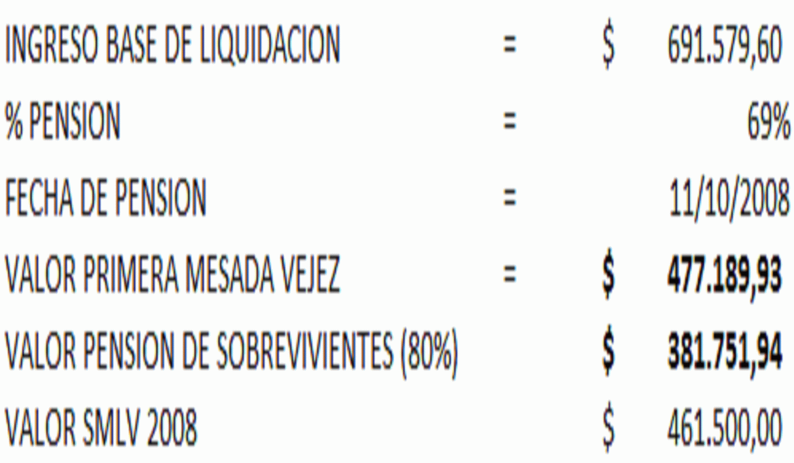 La cuantía inicial de la prestación será igual al salario mínimo legal vigente, $461.500.oo, teniendo en cuenta las reglas frente al ingreso base de liquidación y monto de la pensión, definidas en los artículos 21 y 46 de la Ley 100 de 1993 y, en especial, lo previsto en el parágrafo de esta última norma, con base en el cual el monto «…será del 80% del monto que le hubiera correspondido en una pensión de vejez…», como se muestra en el siguiente cuadro: