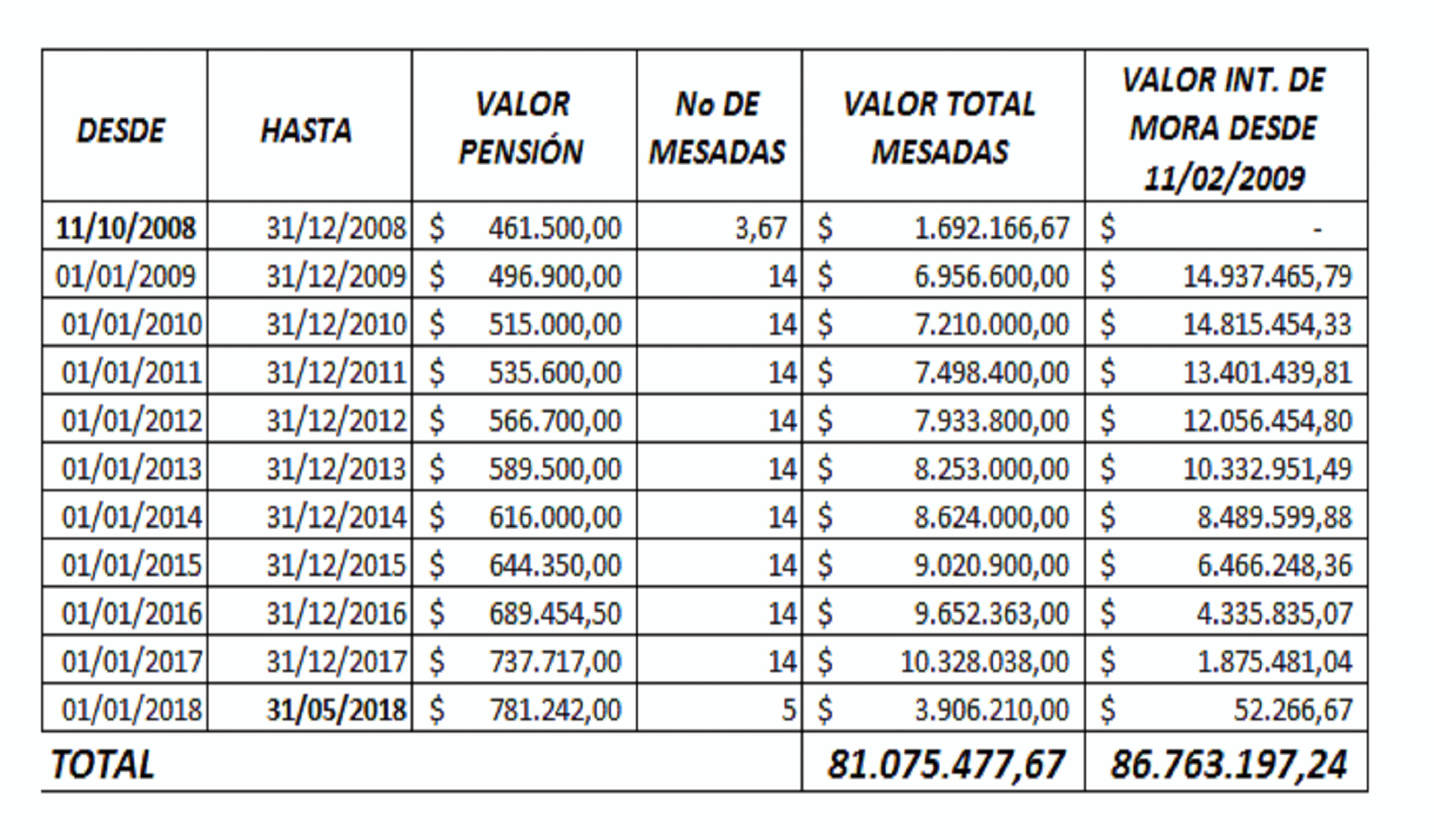 Por concepto de mesadas adeudadas hasta el 31 de mayo de 2018 se adeuda la suma de $81.075.477.67 y por intereses hasta la misma data $86.763.197.24, sin perjuicio de los que se causen con posterioridad, como se refleja en el siguiente cuadro: