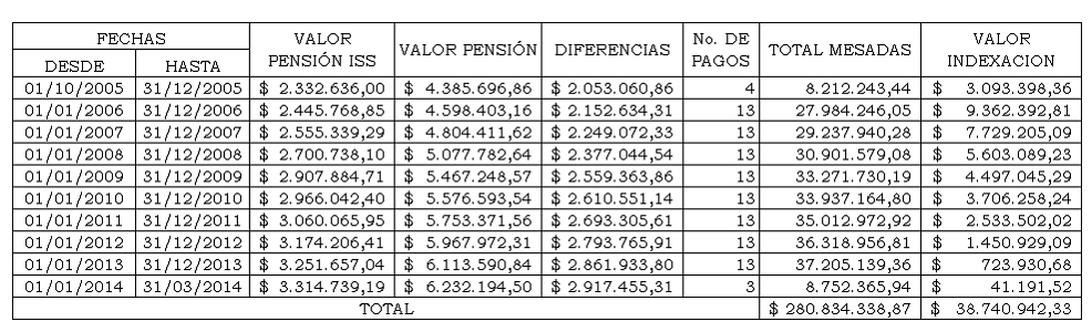 En ese sentido, se modificará la sentencia apelada para fijar el monto de la pensión de vejez del actor en la suma de $4.385.696.86, a partir del 1 de octubre de 2005. Por concepto de retroactivo pensional, derivado de las diferencias dejadas de pagar, hasta el mes de marzo de 2014, se adeuda la suma de $280.834.338.87, así como la suma de $38.740.942.33 por concepto de indexación, de acuerdo con el siguiente cuadro:
