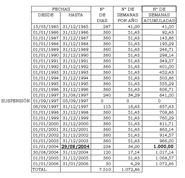 Para determinar el momento en que la actora acreditó el requisito de semanas cotizadas en el sistema, se remite al certificado de tiempo de servicios de la actora, donde aparece que ésta prestó sus servicios a TELECOM entre el 15 de marzo de 1985 y el 31 de enero de 2006, con una interrupción de cinco (5) días comprendidos entre el 1º de septiembre de 1997 y el 05 de septiembre de 1997; de donde deduce que la actora acredita 1000 semanas de cotizaciones para el 29 de agosto de 2004.