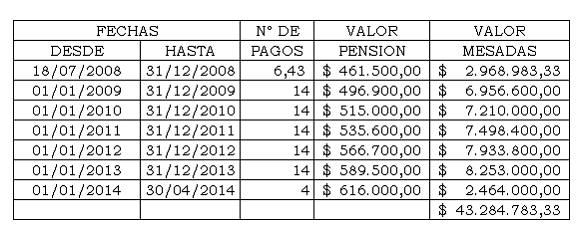 Por mesadas causadas con los respectivos incrementos legales y las mesadas adicionales, para el período comprendido entre el 18 de julio de 2008 y el 30 de abril de 2014, la sociedad demandada debe cancelar al demandante la suma de $43.284.783,33, debiendo continuar cancelando la pensión de invalidez con una mesada para el año 2014 de $616.000,oo mensuales. Lo anterior es posible condensarlo en el siguiente cuadro:
