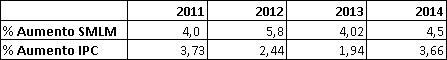 De haber sido, como dice la censura, que la bonificación se determinó con base en el incremento del salario mínimo, en vez del IPC, lo que es una suposición del recurrente, dado que, en la motivación del laudo no se hizo especificación en este sentido, en todo caso considera la Sala que el argumento del atacante del laudo es infundado, toda vez que el factor de aumento del SMLM no es un criterio abiertamente inequitativo como ella lo asevera, dado que, conforme se puede ver enseguida, la tasa de ajuste del salario mínimo no dista mucho de la variación anual del IPC, entre los años 2011 al 2014, a los que la censura refiere como soporte para su crítica, no obstante, se itera, que el tribunal no hizo alusión a ellos y que tampoco relacionó la susodicha bonificación como aumento de los años 2011 al 2014, sino que esto lo supone el contradictor de la sentencia.