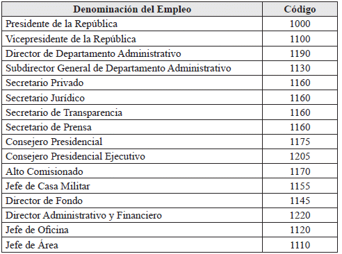 ARTÍCULO 1o. CLASIFICACIÓN DE LOS EMPLEOS POR NIVELES. Según la naturaleza general de sus funciones, las competencias y los requisitos exigidos para su desempeño, los empleos públicos del Departamento Administrativo de la Presidencia de la República se clasifican en los siguientes niveles jerárquicos: