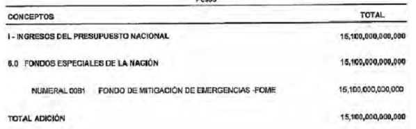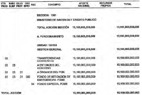 ARTICULO 2. ADICIONES AL PRESUPUESTO DE GASTOS O LEY DE APROPIACIONES. Adiciónese el Presupuesto de Gastos o Ley de Apropiaciones del Presupuesto General de la Nación de la vigencia fiscal de 2020, en la suma de QUINCE BILLONES CIEN MIL MILLONES DE PESOS MONEDA LEGAL ($15.100.000.000.000), según el siguiente detalle: