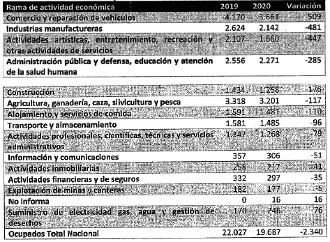 Que según el mismo documento, la tasa de desempleo en el total de las 13 ciudades y áreas metropolitanas fue 23,5%, lo que representó un aumento de 12,4 puntos porcentuales frente al mismo mes del año pasado (11,1%). La tasa global de participación se ubicó en 53,8%, lo que significó una reducción de 11,4 puntos porcentuales frente a abril del 2019 (65,2%). Entre tanto, la tasa de ocupación fue 41,2%, lo que representó una disminución de 16,7 puntos porcentuales respecto al mismo mes del 2019 (57,9%).