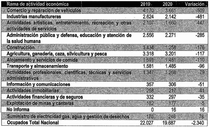 Que según el mismo documento, la tasa de desempleo en el total de las 13 ciudades y áreas metropolitanas fue 23,5%, lo que representó un aumento de 12,4 puntos porcentuales frente al mismo mes del año pasado (11,1%). La tasa global.de participación se ubicó en 53,8%, lo que significó una reducción de 11,4 puntos porcentuales frente a abril del 2019 (65,2%). Entre tanto, la tasa de ocupación fue 41,2%,.lo que representó una disminución de 16,7 puntos porcentuales respecto al mismo mes del 2019 (57,9%).