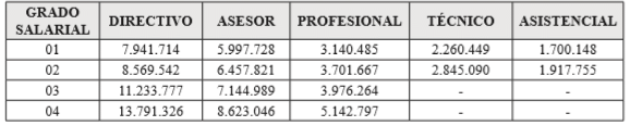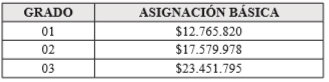 PARÁGRAFO 1o. En la escala de asignación básica fijada en el presente artículo, la primera columna señala los grados salariales correspondientes a las distintas denominaciones de empleos y la segunda columna indica la asignación básica mensual establecida para cada grado.