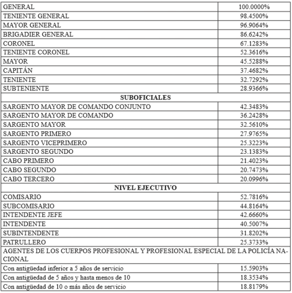 Los sueldos básicos mensuales para el personal a que se refiere este artículo, corresponderán al porcentaje que se indica para cada grado, con respecto a la asignación básica del grado de General.