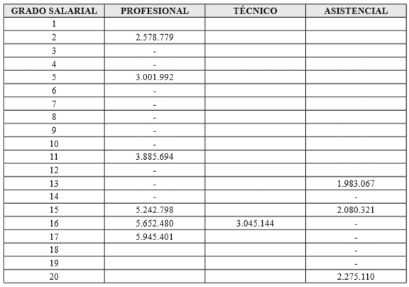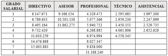 PARÁGRAFO 1o. En la escala salarial fijada en el presente artículo, la primera columna señala los grados correspondientes a las distintas denominaciones de empleos y la segunda y siguientes columnas indican la asignación básica mensual establecida para cada nivel y grado.