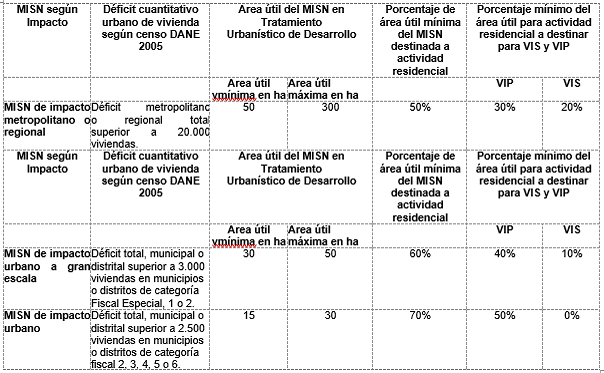 ARTÍCULO 2.2.4.2.2.2.2. DIMENSIÓN DE LOS MACROPROYECTOS Y PORCENTAJES MÍNIMOS Y MÁXIMOS DE LAS ÁREAS DESTINADAS A VIP Y VIS. Los Macroproyectos deberán cumplir para efectos de su anuncio, formulación y adopción las condiciones de área mínima y máxima y porcentaje de área útil para actividad residencial y para VIS y VIP que se señalan a continuación, según se trate de Macroproyectos de impacto metropolitano o regional, Macroproyectos de impacto urbano a gran escala o Macroproyectos de impacto urbano: