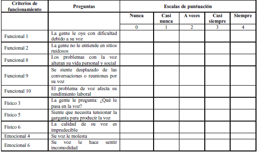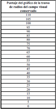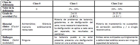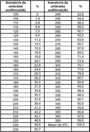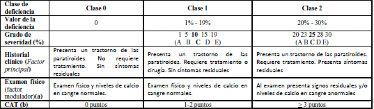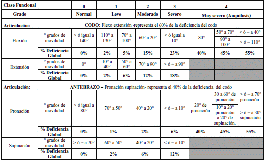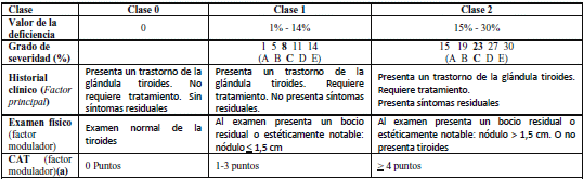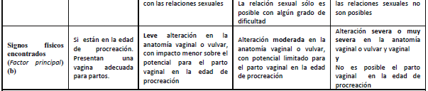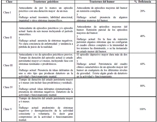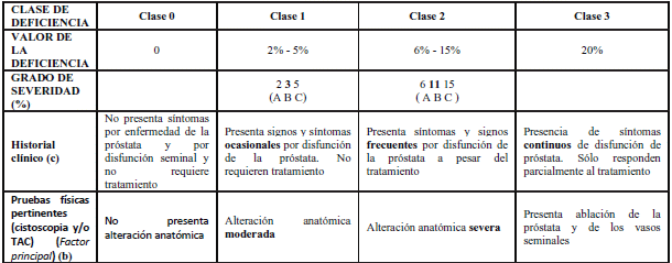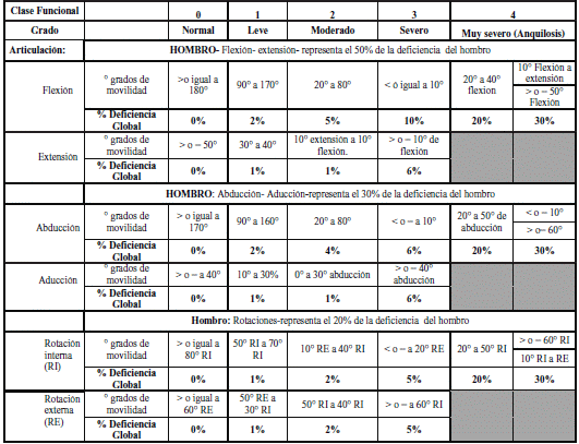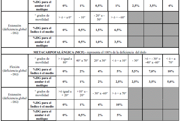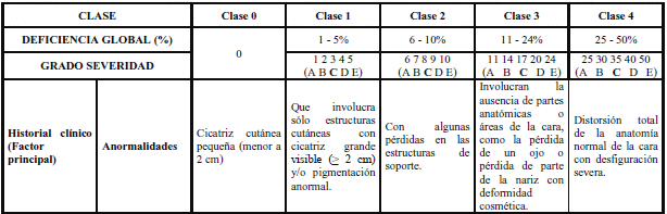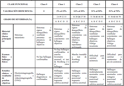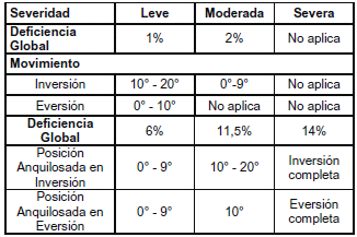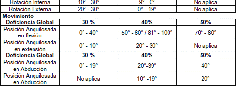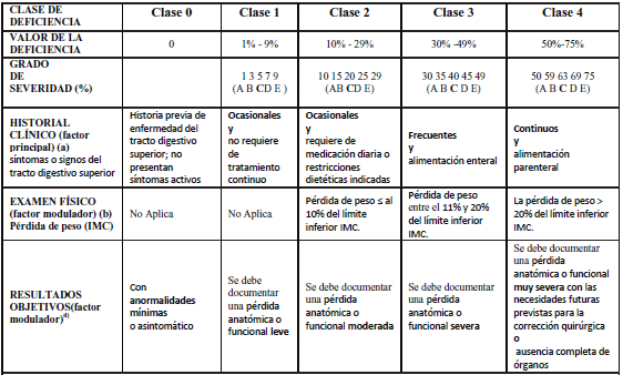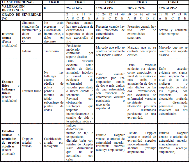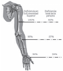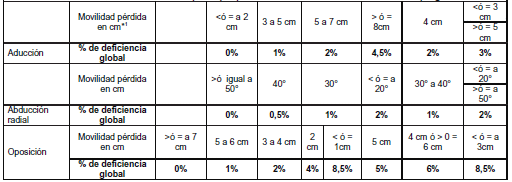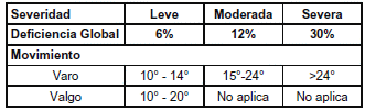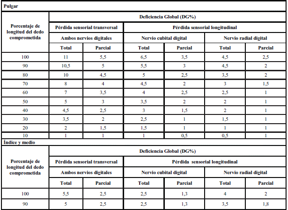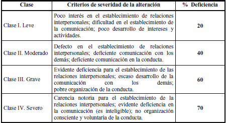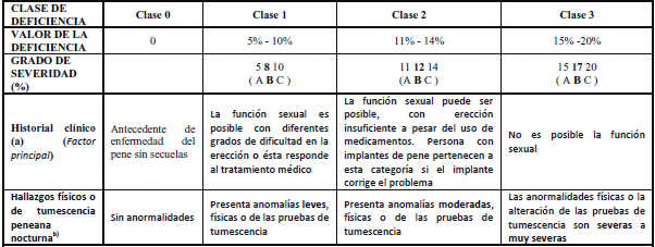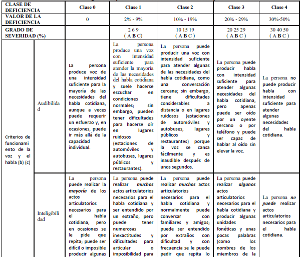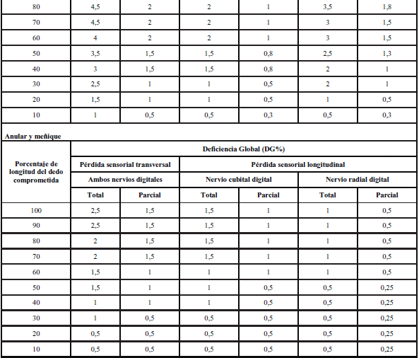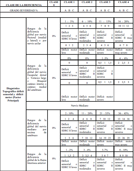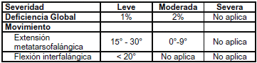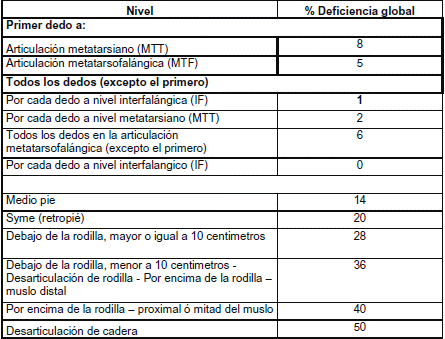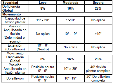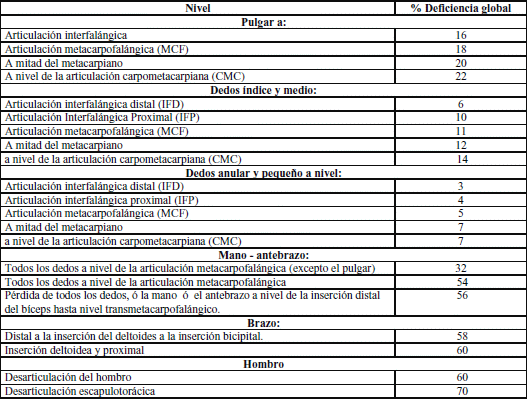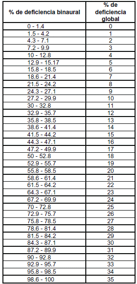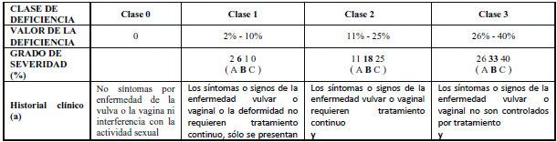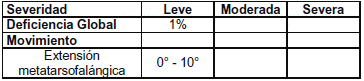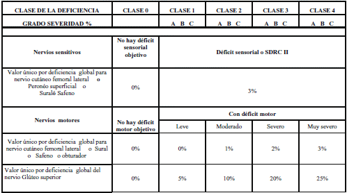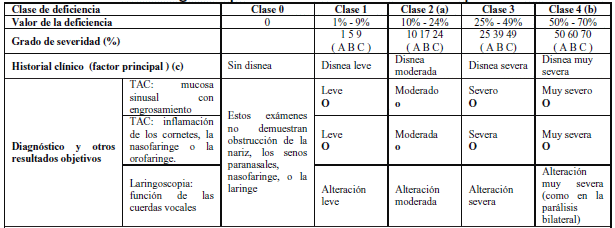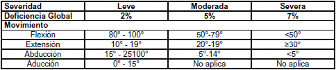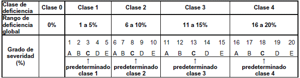 | Valoración de la deficiencia (%) | 0 | Mínima % | Moderada % | Severa % | Muy severa % |