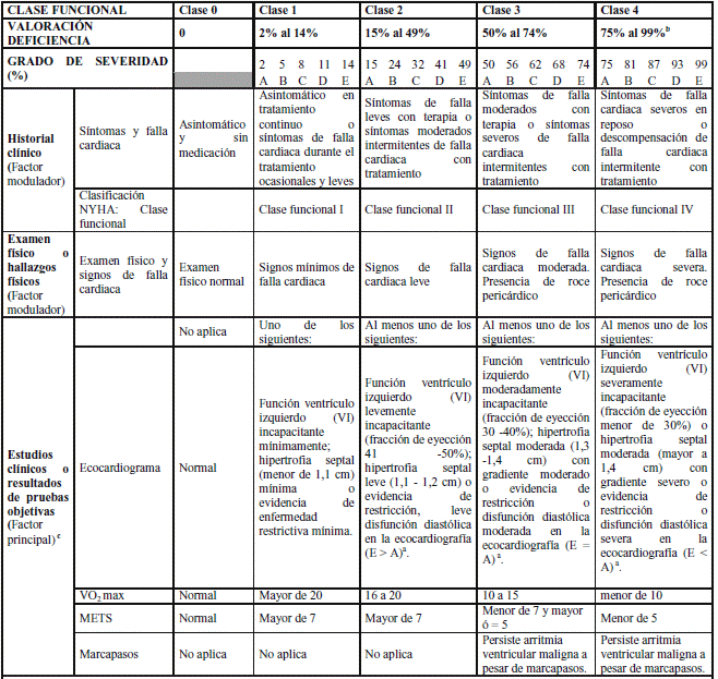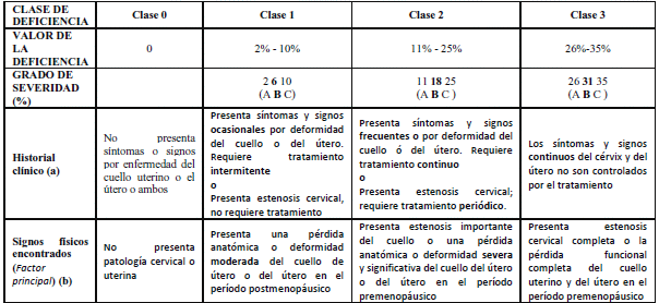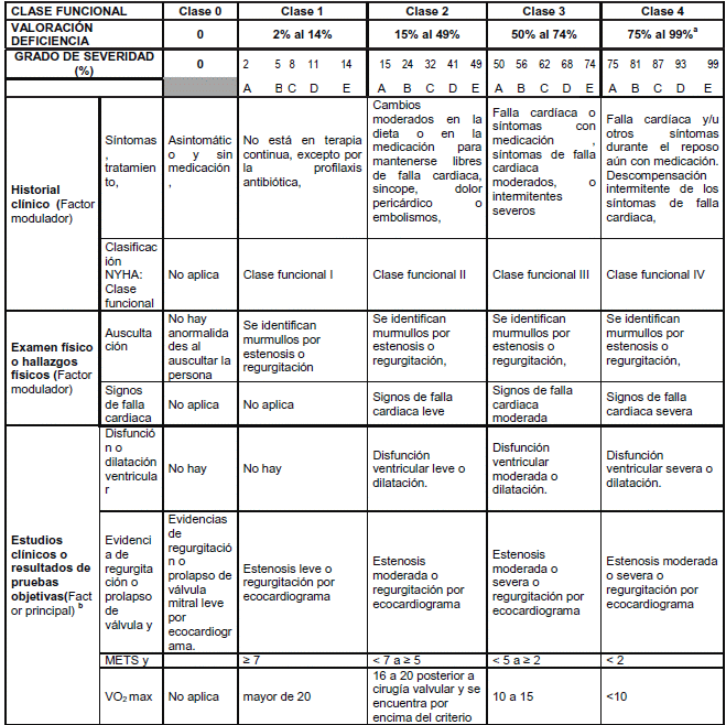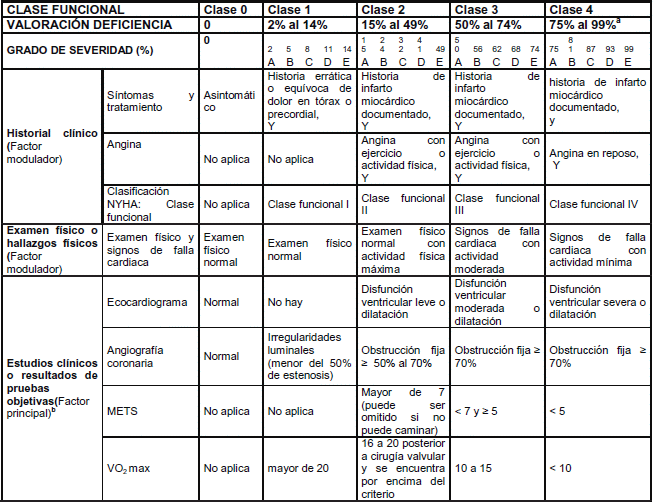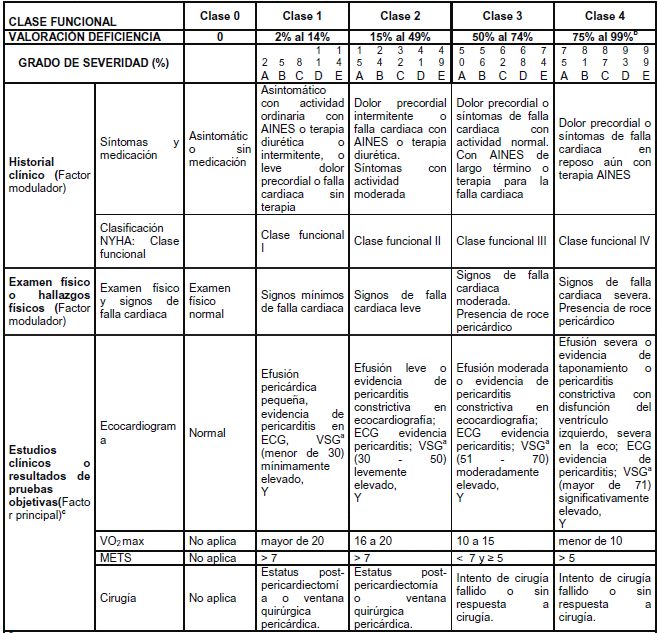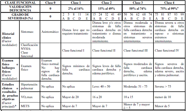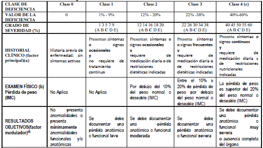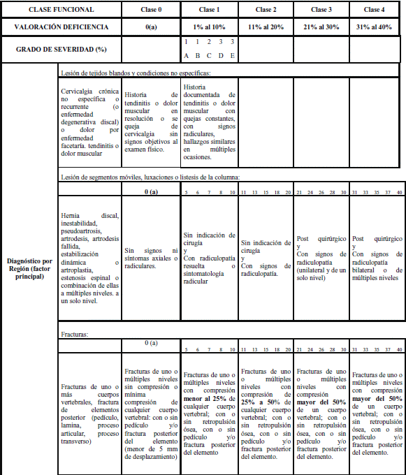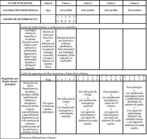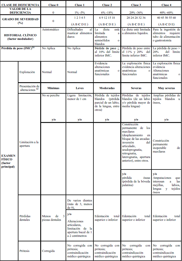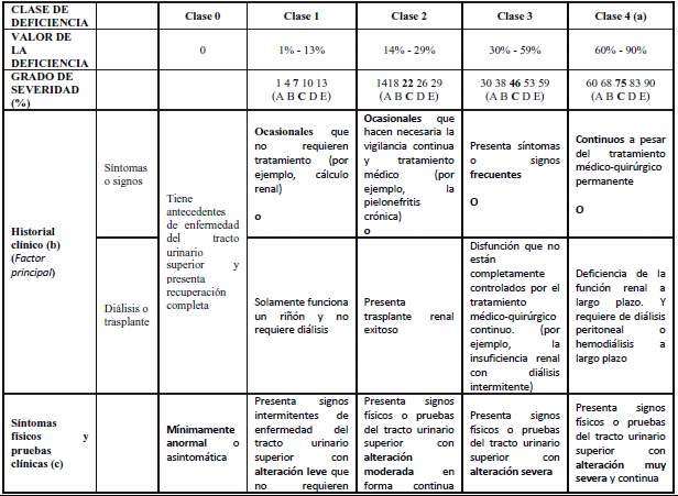 a. Clase de deficiencia: La tabla de calificación más amplia contiene cinco (5) clases (columnas), según lo aplicable en cada capítulo; se numeran de 0 a 4. No obstante hay algunas tablas con sólo tres (3) clases.