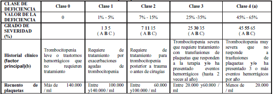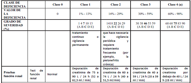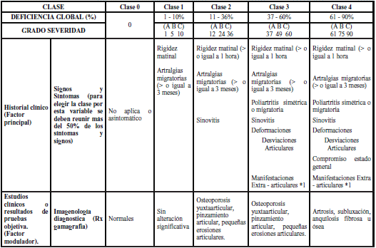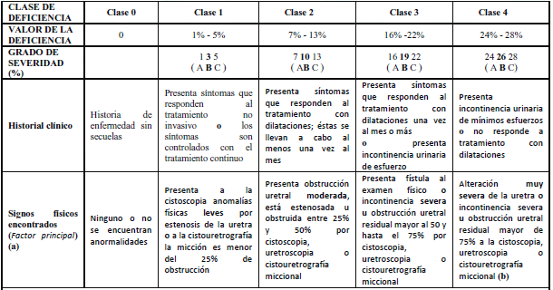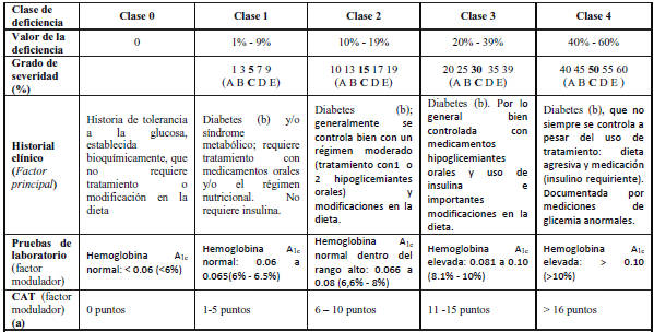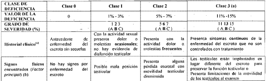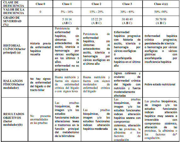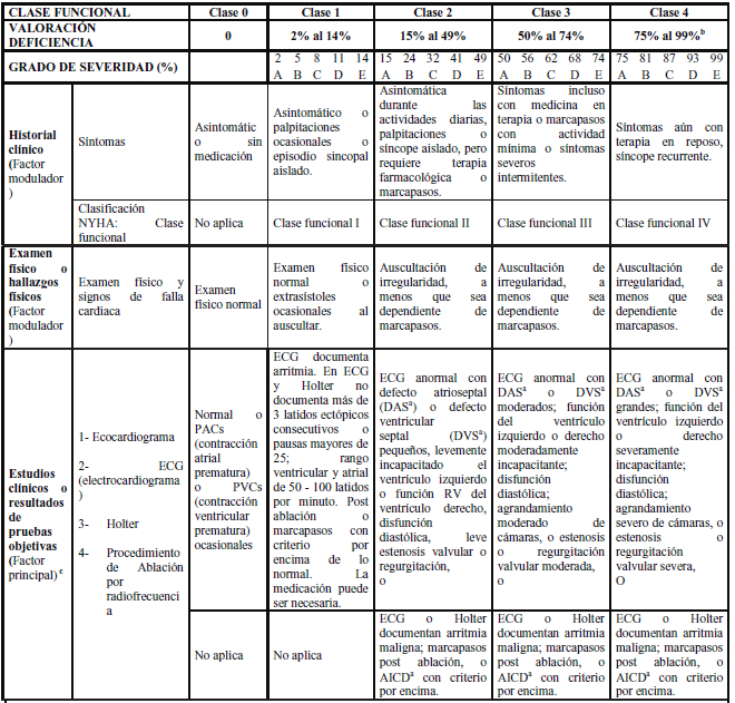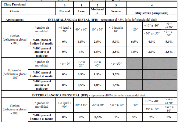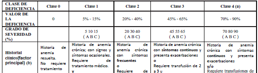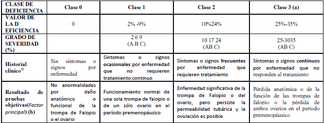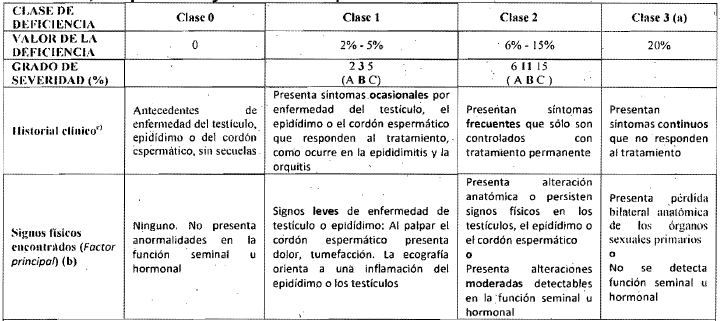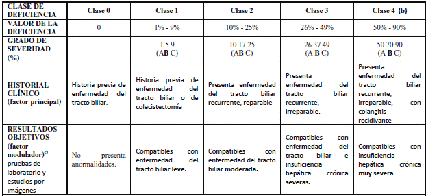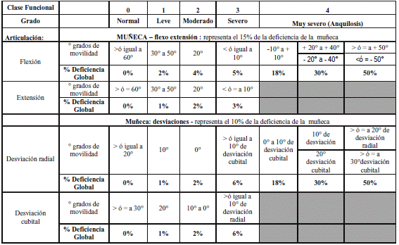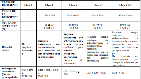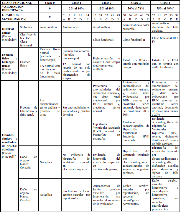 a. Clase de deficiencia: La tabla de calificación más amplia contiene cinco (5) clases (columnas), según lo aplicable en cada capítulo; se numeran de 0 a 4. No obstante hay algunas tablas con sólo tres (3) clases.