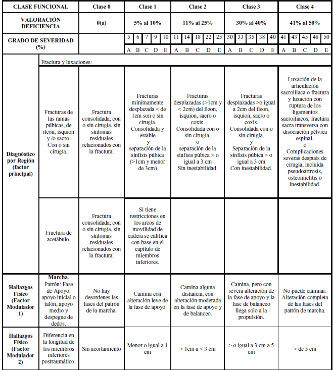 La fractura del acetábulo: Fractura consolidada no desplazada sin deformidad estructural residual y sin síntomas residuales corresponden a la clase 0. Si tiene restricciones de los arcos de movimiento se califica en el capítulo de miembros inferiores para luego combinarlos.