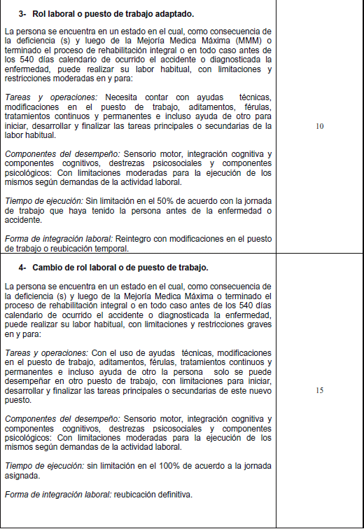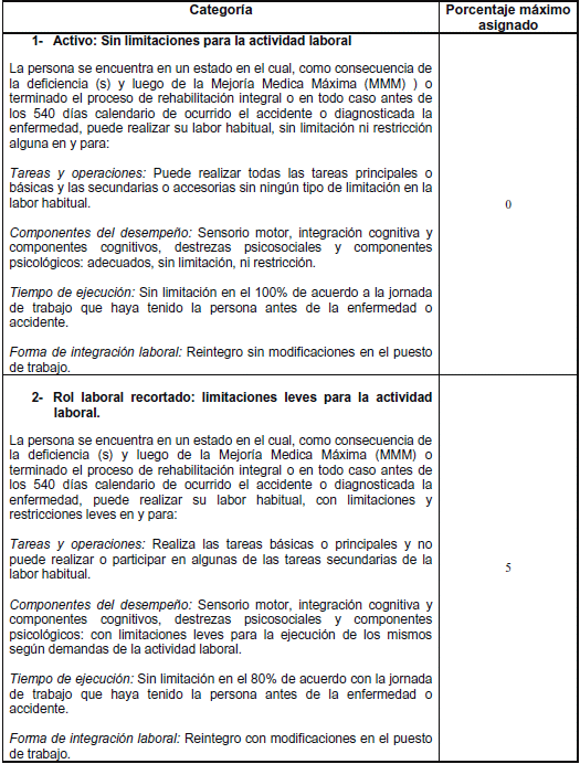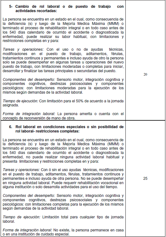 4. Clasificación de las restricciones en el rol laboral. Para una mayor facilidad en la comprensión y valoración que respecto al rol laboral, puede presentar una persona como consecuencia de una deficiencia (s), estas restricciones se han dividido por categorías; cada categoría a su vez tiene un puntaje máximo calificable. Para facilitar la evaluación se tendrá como guía el "Manual de Procedimientos para la Rehabilitación y Reincorporación Ocupacional de los Trabajadores en el Sistema General de Riesgos Profesionales" o el Manual que lo modifique o sustituya, y lo descrito en instrumentos construidos para valorar repercusiones en el rol laboral. En la tabla 1 se condensa esta clasificación con los puntajes respectivos. Así mismo, se incluyen las categorías que incluyen los puntajes en función de la autosuficiencia económica y de edad cronológica que aplican para efectos de calificación. Las tablas 2 y 3 explican estas categorías.