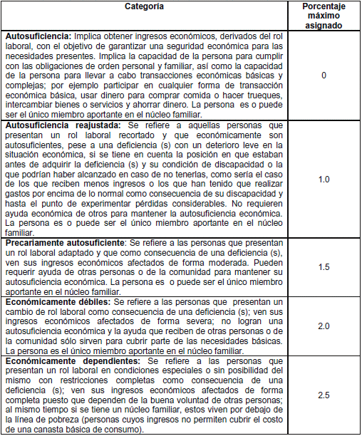 2.2. Autosuficiencia económica: Hace referencia fundamentalmente a la autosuficiencia y nivel económico que puede tener una persona en relación directa con la repercusión o impacto económico negativo generado por una deficiencia. Incluye la capacidad de la persona para cumplir con el mínimo vital de la persona y su familia.
