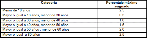 d. Para calificar la edad, se selecciona ésta en una de las seis categorías o intervalos descritos, asignando el valor correspondiente de acuerdo con la tabla 3 - Clasificación de las restricciones en función de edad cronológica, que tiene un valor máximo de 2.5%.
