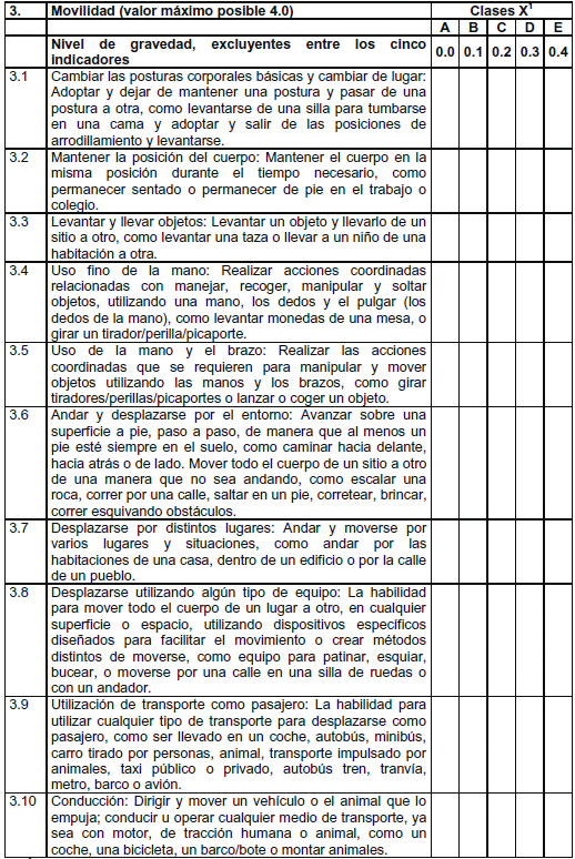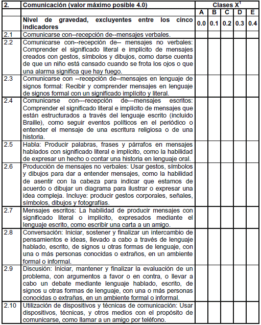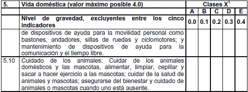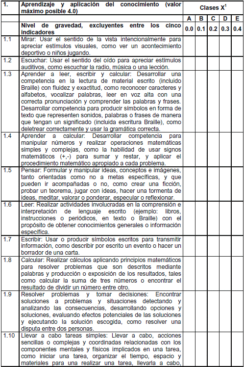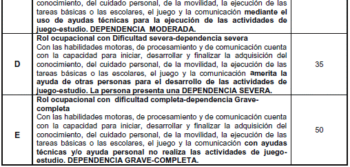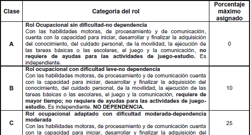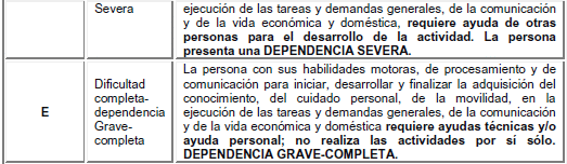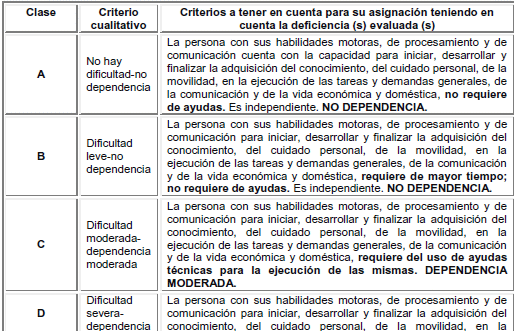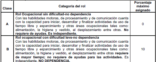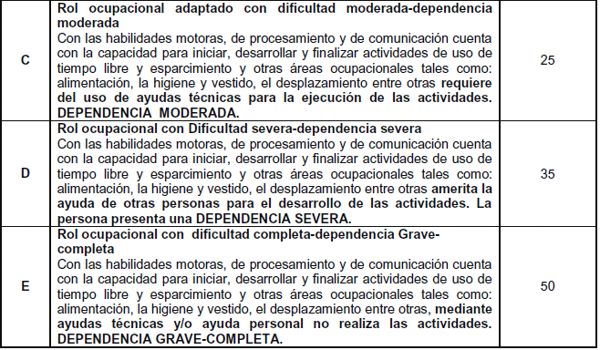 3.2. Escala de calificación. Para una mejor comprensión y facilidad del tipo de compromiso que puede tener una persona en estas cinco áreas ocupacionales, se aplica una escala de calificación compuesta por clases mutuamente excluyentes, denominadas: A, B, C, D y E. Estas incorporan criterios cualitativos, necesidad de ayudas y grado de dependencia cuando aplican. Esta escala aparece en la tabla 4.