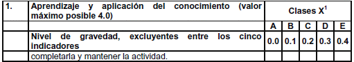 Cada área ocupacional, tiene un valor máximo de 4.0 (cuatro), con valores internos proporcionales de gravedad, de acuerdo con el número de categorías por cada área ocupacional. El área ocupacional de aprendizaje y aplicación del conocimiento, tiene 16 categorías, cada una de estas con los siguientes niveles de gravedad: