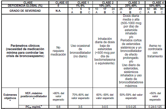 | Historial clínico a | Sin síntomas en la actualidad y/o con síntomas intermitentes que no requieren tratamiento. | Síntomas controlados con tratamiento continuo o síntomas intermitentes leves pese a tratamiento continuo. | Síntomas constantes leves pese a tratamiento continuo o síntomas intermitentes moderados pese a tratamiento continuo | Síntomas constantes moderados pese a tratamiento continuo osíntomas intermitentes severos pese a tratamiento continuo | Síntomas constantes severos pese a tratamiento continuo osíntomas intermitentes muy severos pese a tratamiento continuo |