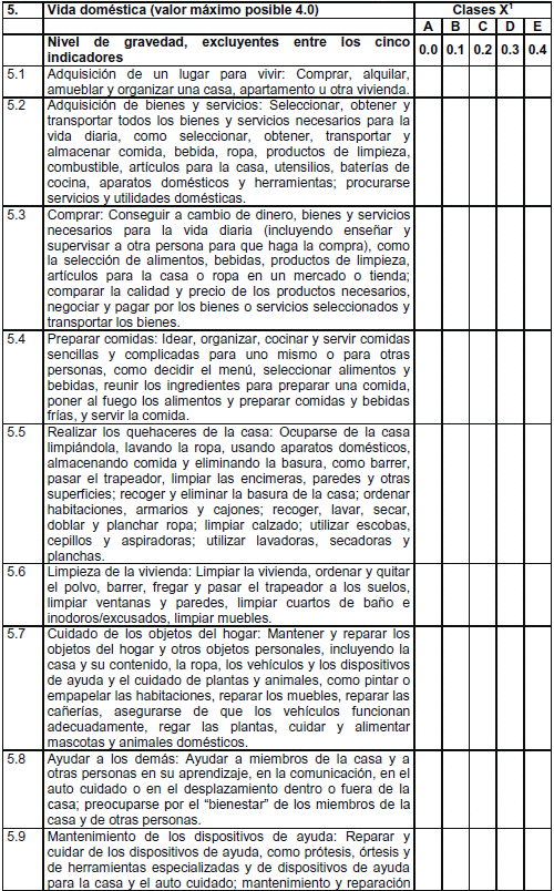 e. Vida doméstica: Trata sobre cómo llevar a cabo tareas y acciones domésticas y cotidianas. Las áreas de la vida doméstica incluyen conseguir un lugar para vivir, comida, ropa y otras necesidades, limpiar y reparar el hogar, cuidar de los objetos personales y de los del hogar y ayudar a otras personas. Las áreas ocupacionales se expresan en la tabla 5 con los valores de gravedad máximos individuales para la calificación.