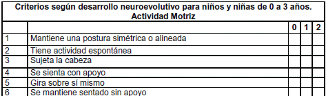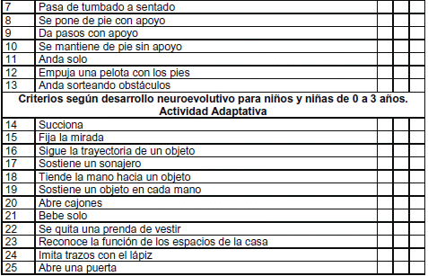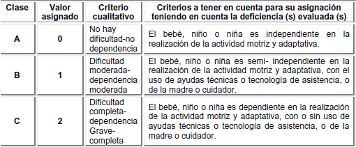Trata sobre la valoración para niños y niñas de 0 a 3 años, con base en el desarrollo neuroevolutivo propio de esta etapa del ciclo vital. Para su aplicación se tiene en cuenta la actividad motriz y la actividad adaptativa, de acuerdo con la escala de calificación dada en la tabla 11. Para esto, se utilizan las 25 categorías expuestas en la tabla 12.