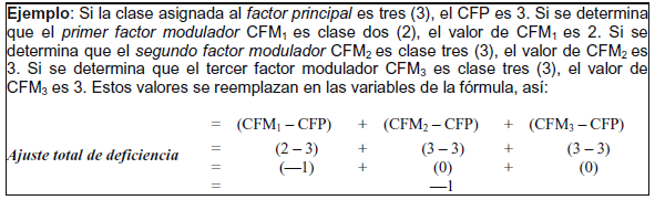 4.3 Factores moduladores: Son los criterios que pueden modificar el porcentaje del grado de severidad de una deficiencia dentro de una clase funcional predeterminada por el factor principal. Este factor modifica la severidad de la deficiencia dentro de la clase funcional.