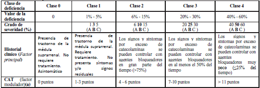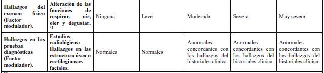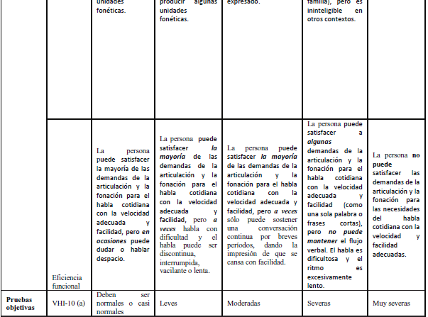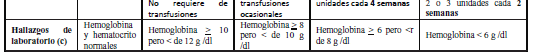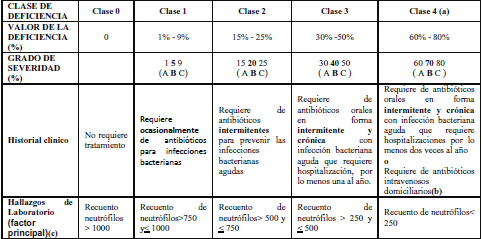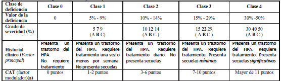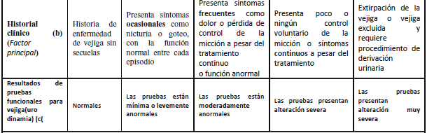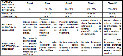 | Estudios clínicos o resultados de pruebas objetivas c | Normales en la actualidad | Consistentemente normales con tratamiento continuo oanormalidades leves e intermitentes | Anormalidades leves persistentes pese a tratamiento continuo oanormalidades moderadas intermitentes | Anormalidades moderadas persistentes pese a tratamiento continuo oanormalidades severas intermitentes | Anormalidades severas persistentes pese a tratamiento continuo o anormalidades muy severas intermitentes |