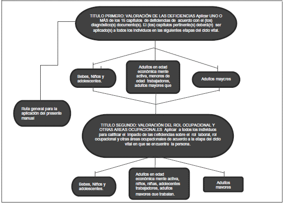 | TÍTULO PRIMERO VALORACIÓN DE LAS DEFICIENCIAS Capítulo 1 Deficiencias por alteraciones debidas a neoplasias o cáncer. Capítulo 2 Deficiencias por alteraciones del sistema cardiovascular. Capítulo 3 Deficiencias por trastornos del sistema respiratorio. Capítulo 4 Deficiencias del sistema digestivo. Capítulo 5 Deficiencias del sistema urinario y reproductor. Capítulo 6 Deficiencias por trastornos de la piel, faneras y daño estético. Capítulo 7 Deficiencias por alteraciones del sistema hematopoyético. Capítulo 8 Deficiencias por alteraciones del sistema endocrino. Capítulo 9 Deficiencias por alteraciones del sistema auditivo y vestibular. Capítulo 10 Deficiencias por alteraciones del olfato, del gusto, de la voz, del habla y de las vías aéreas superiores. Capítulo 11 Deficiencias por alteraciones del sistema visual. Capítulo 12 Deficiencias del sistema nervioso central y periférico. Capítulo 13 Deficiencias por trastornos mentales y del comportamiento. Capítulo 14 Deficiencias por alteración de las extremidades superiores e inferiores. Capítulo 15 Deficiencias por alteraciones de la columna vertebral y la pelvis. | TÍTULO SEGUNDO VALORACIÓN DEL ROL LABORAL, ROL OCUPACIONAL Y OTRAS ÁREAS OCUPACIONALES Capítulo 1. Generalidades. Capítulo 2. Calificación del rol laboral. Capítulo 3. Calificación de otras áreas ocupacionales. Capítulo 4. Valoración de roles ocupacionales. |