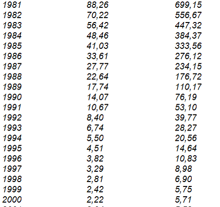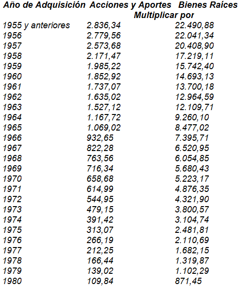 2. El valor que se obtenga de multiplicar el costo de adquisición del bien enajenado por la cifra de ajuste que figure frente al año de adquisición del mismo, conforme con la siguiente tabla: