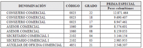 ARTÍCULO 4o. PRIMA ESPECIAL. A partir de la entrada en vigencia del presente decreto, créase una prima especial para los funcionarios de la planta externa del Ministerio de Comercio, Industria y Turismo, que se pagará en forma mensual, así: