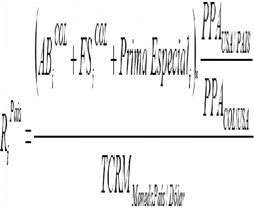 PPAUSA/PAIS = Indice de Paridad de Poder Adquisitivo entre Estados Unidos y el país donde se encuentra ubicado el funcionario del Ministerio de Comercio, Industria y Turismo, emitido por el Fondo Monetario Internacional anualmente, con un año de rezago.